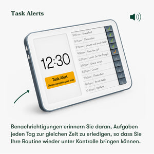 Aufgaben wie "Frühstück einnehmen um 8 Uhr", "Medikamente um 9 Uhr einnehmen" oder "Katze um 17 Uhr füttern" können einfach programmiert und abgehakt werden, während Sie Ihren Tag gestalten.