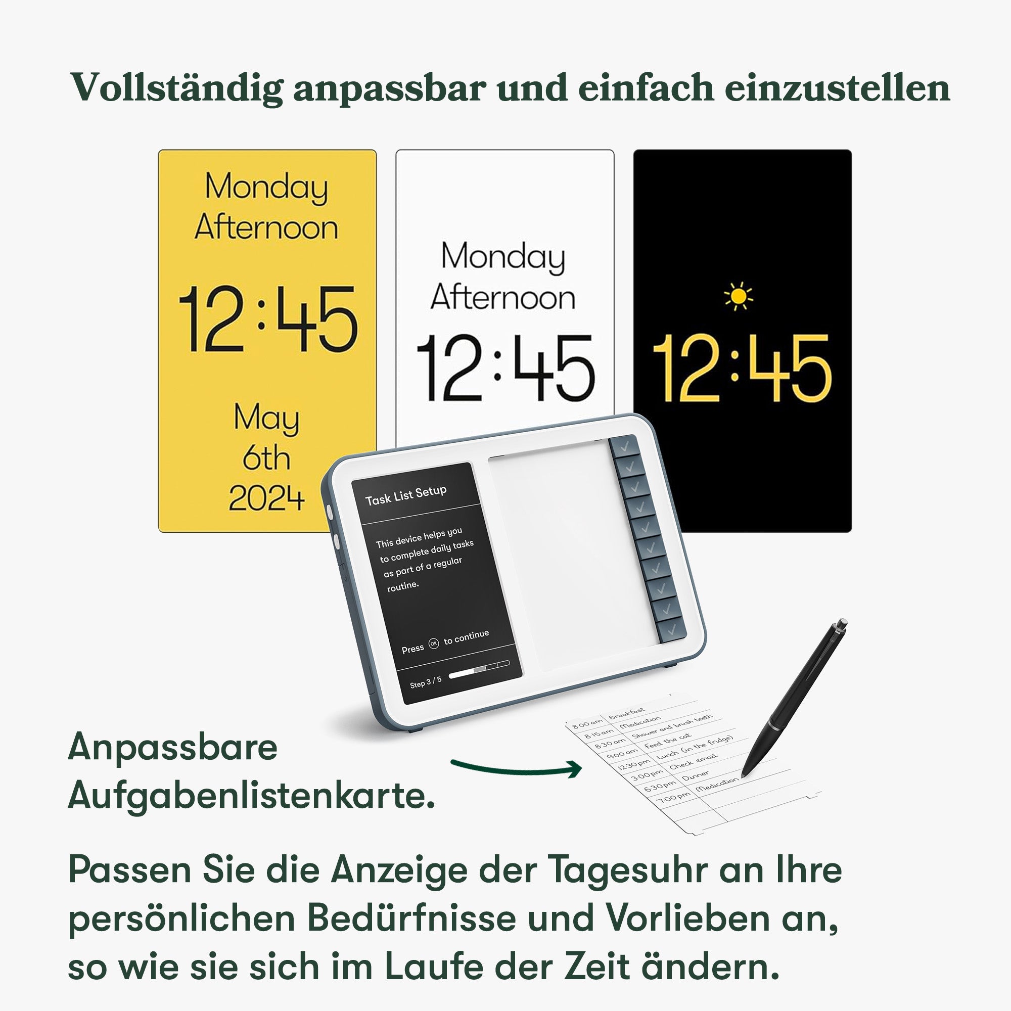 Entdecken Sie die Möglichkeit der einzigartigen Personalisierung mit unserem Tagesuhr-Bildschirm. Gestalten Sie ihn ganz nach Ihren individuellen Bedürfnissen und Vorlieben. Einfache Anpassungen ermöglichen es Ihnen, die Anzeige zu vereinfachen, Farbkombinationen zu ändern oder Symbole anstelle von Text auszuwählen. Machen Sie Ihren Tagesuhr-Bildschirm zu einem ganz persönlichen und intuitiven Begleiter durch den Tag.