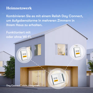 Verpassen Sie nie wieder eine wichtige Aufgabe, indem Sie den Day Hub mit dem Day Connect (optional erhältlich) verbinden und Benachrichtigungen im gesamten Haus hören. Bleiben Sie unabhängig, aktiv und beruhigt den ganzen Tag über mit dem Day Hub von Relish - Ihrer perfekten Lösung für ein stressfreies Leben trotz Demenz.
