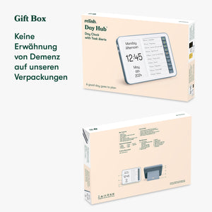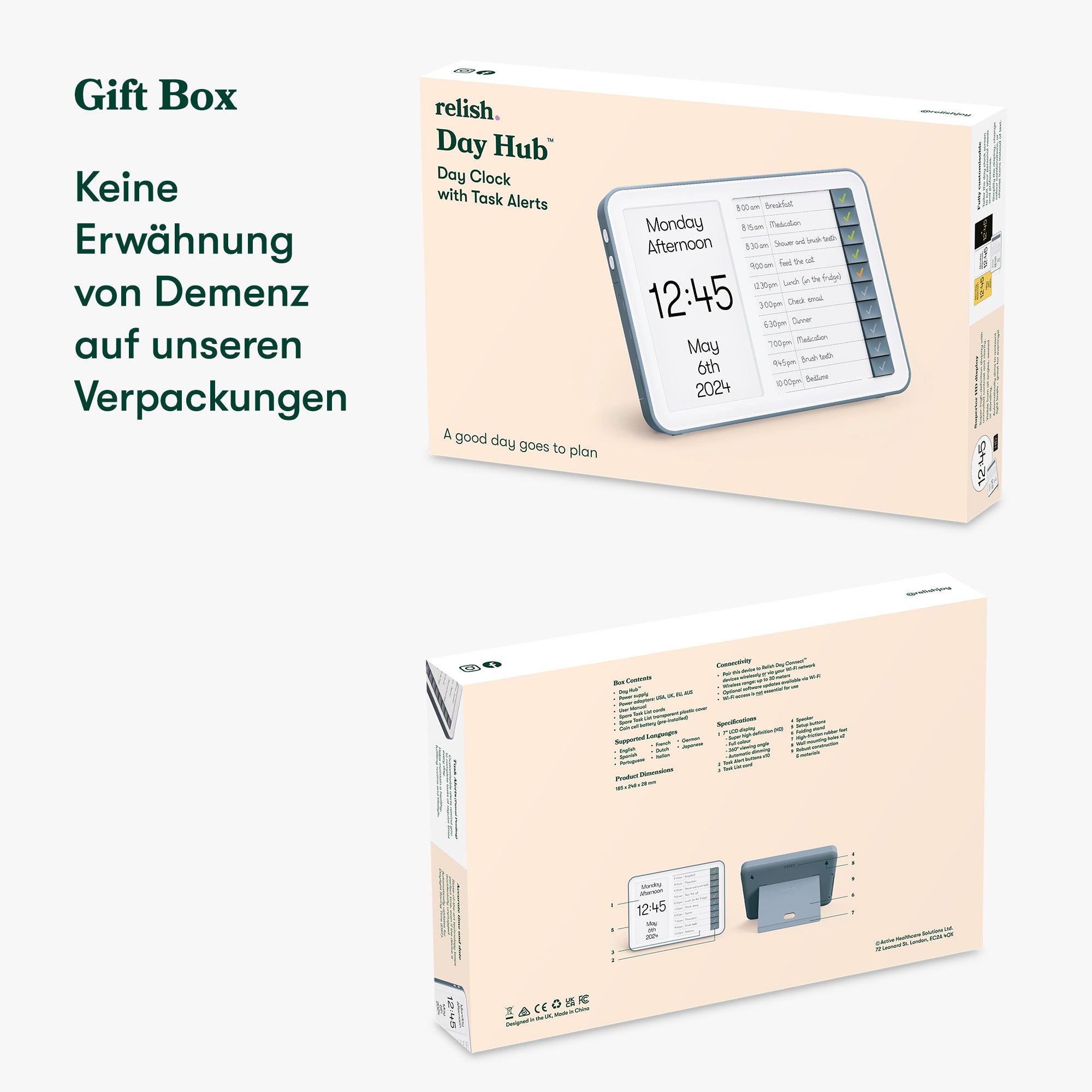 Die perfekte Kombination aus Funktionalität und Stil entdecken Sie mit dem Relish Day Hub und der Relish Day Connect (optional erhältlich) . Platzieren Sie den Day Hub in Ihrem Hauptwohnraum und ergänzen Sie ihn mit der handlichen Day Connect – ideal für zusätzliche Räume. Beide bieten präzise Zeitmessung und automatische tageslichtsparende Updates. Der Day Hub ist ein ideales Geschenk für Großeltern, ältere Menschen und Senioren, ohne dass Demenz auf der Verpackung erwähnt wird.