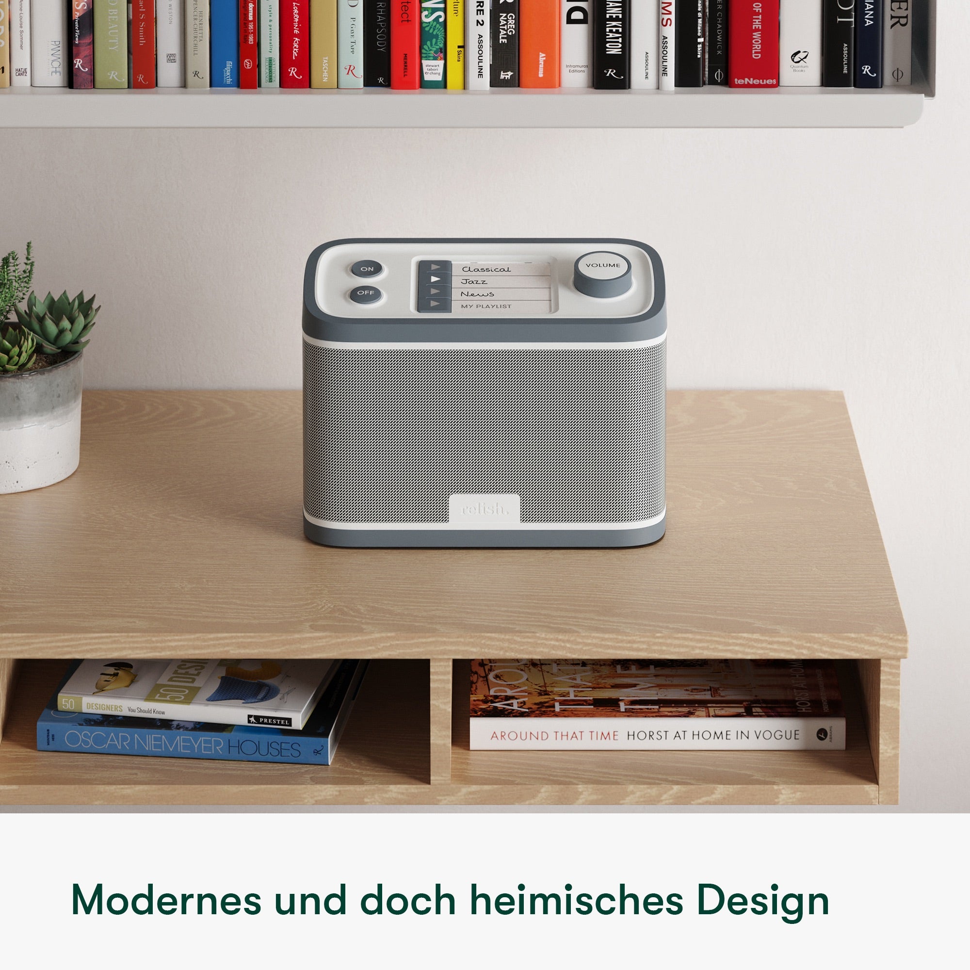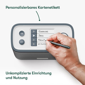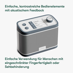 - Einfache Bedienung: Die großen, beschriftbaren Tasten und das personalisierbare Bedienfeld ermöglichen eine intuitive Nutzung. Sender können nach Belieben voreingestellt und mit leicht verständlichen Namen wie "Swinging 60s" oder "Klassik" versehen werden, um Verwirrung zu vermeiden.