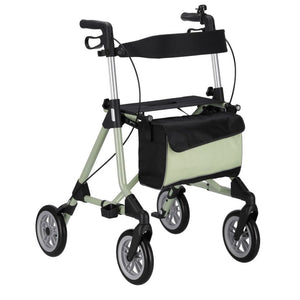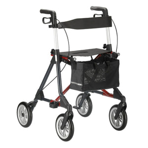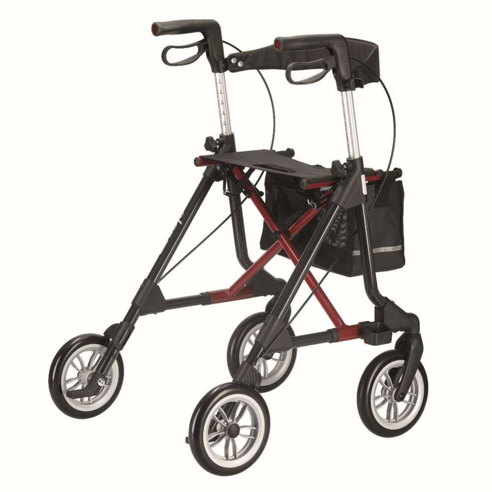 Für den Transport und die platzsparende Aufbewahrung lässt sich der Rollator mühelos zusammenklappen. Die komfortable Sitzfläche und der Rückengurt bieten einen bequemen Platz für kurze Ruhepausen. Eine einfache und sichere Verriegelung sorgt dafür, dass der Rollator im gefalteten Zustand zusammenhält. Faltet man ihn, steht er stabil und lässt sich leicht schieben.