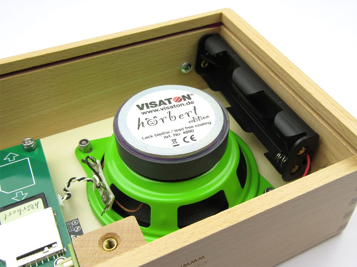Die vorbespielte Speicherkarte enthält eine Auswahl an Musik, Hörspielen, die über die drei farbigen Tasten direkt abgerufen werden können: