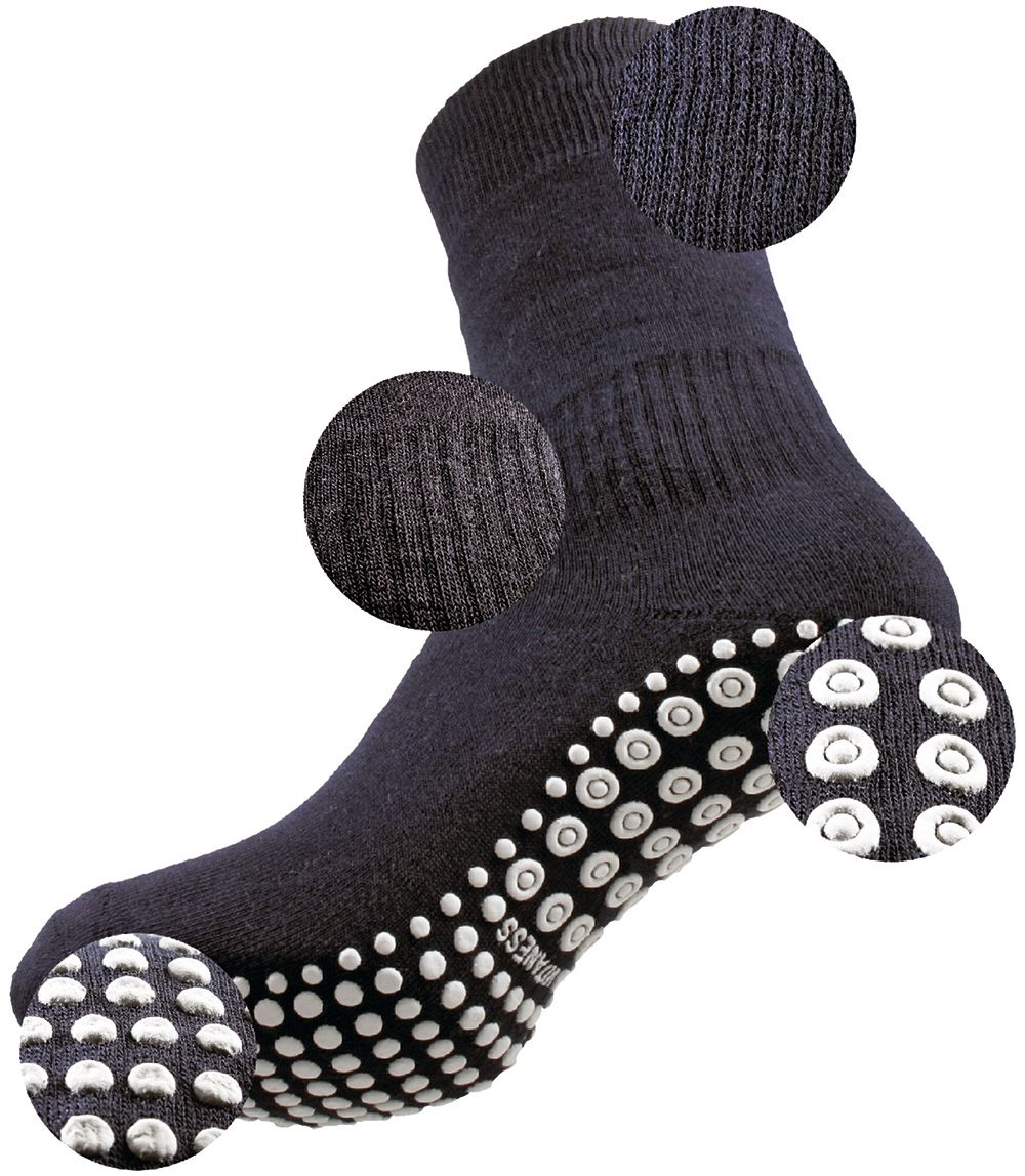 Die Anti-Rutsch-Socken bieten durch ihr innovatives Zweizonen-Sohlenprofil erhöhte Sicherheit beim Gehen, besonders auf glatten Böden. Unter der Ferse sorgt ein besonders stark haftendes Profil für mehr Stabilität, während der Bereich unter dem Ballen eine sanftere Haftung bietet, um Stolpern oder Vornüberfallen zu verhindern. Das gummilose Bündchen dieser Socken ist so gestaltet, dass es nicht einschneidet und somit auch für Diabetiker bestens geeignet ist.