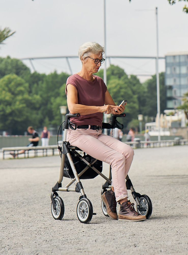 Der Rollator Elan Plus vereint schlichte Eleganz mit umfassender Funktionalität, um Ihnen Sicherheit und Komfort im Alltag zu bieten. Mit seinen weichen Rädern dämpft der Rollator Stöße von unebenen Untergründen wie Feldwegen und Kopfsteinpflaster und sorgt so für ein sanftes Fahrgefühl. Die breite Standfläche verleiht dem Rollator zusätzliche Stabilität und Sicherheit.