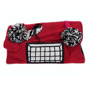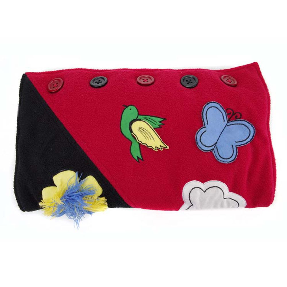 Verschiedene aufgenähte Motive erzeugen sensorische und akustische Reize, wecken Neugier und können als Gesprächsanlass dienen. Die Decke lässt sich mithilfe von Knöpfen zu einem Muff schließen und wärmt dabei zusätzlich die Hände. Zwei unterschiedlich gestaltete Seiten sorgen für vielfältige Eindrücke: eine Seite mit Motiven aus dem Bereich Sport und Fußball, die andere mit Motiven aus der Natur. Das Material ist strapazierfähig und für den regelmäßigen Einsatz geeignet.