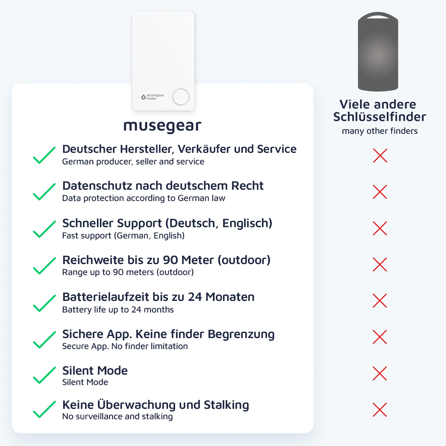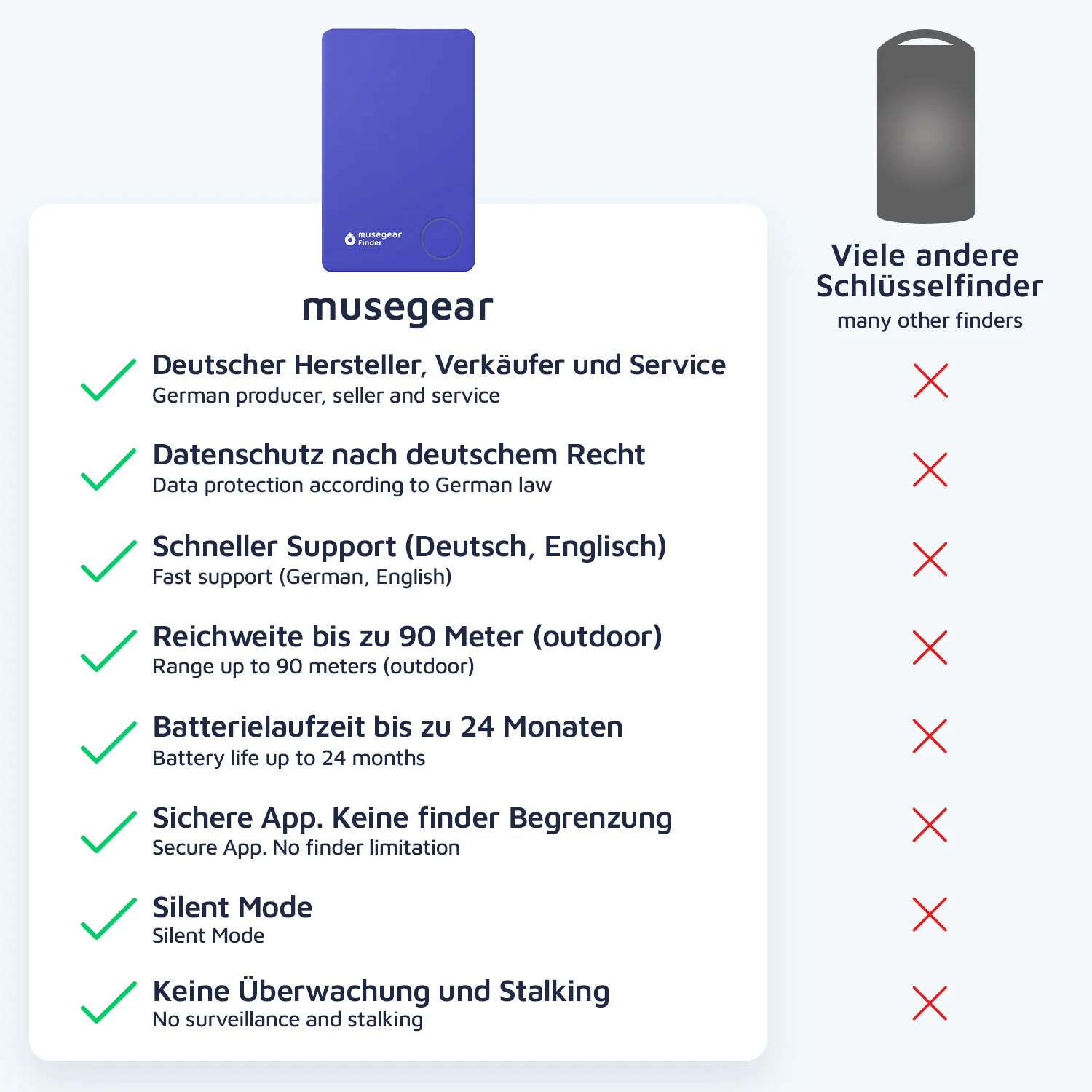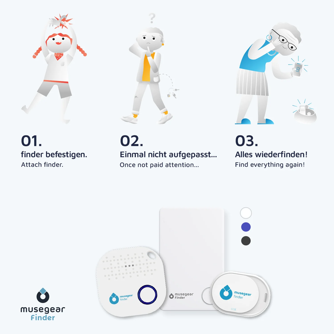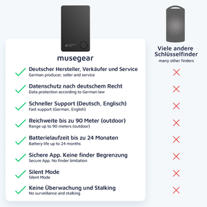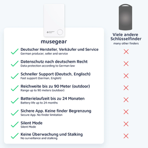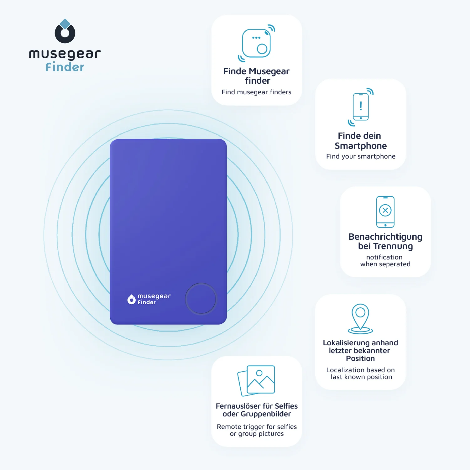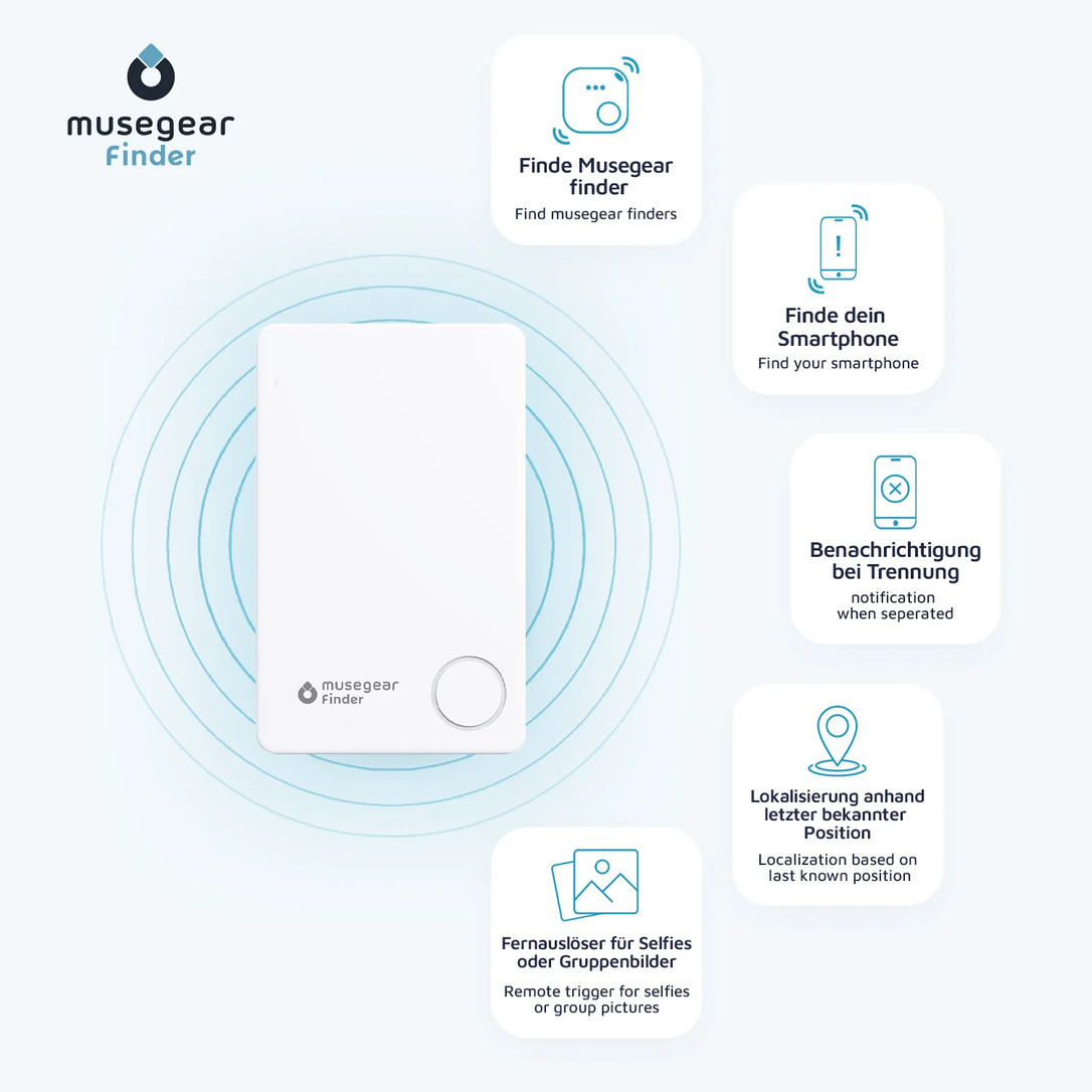 Ganz egal, ob es um Wohnungsschlüssel, Autoschlüssel, Geldbeutel, Smartphone, Fernbedienung, Tablet oder Handtasche geht - mit dem innovativen und äußerst effizienten musegear Tracker findest du alles im Handumdrehen wieder.