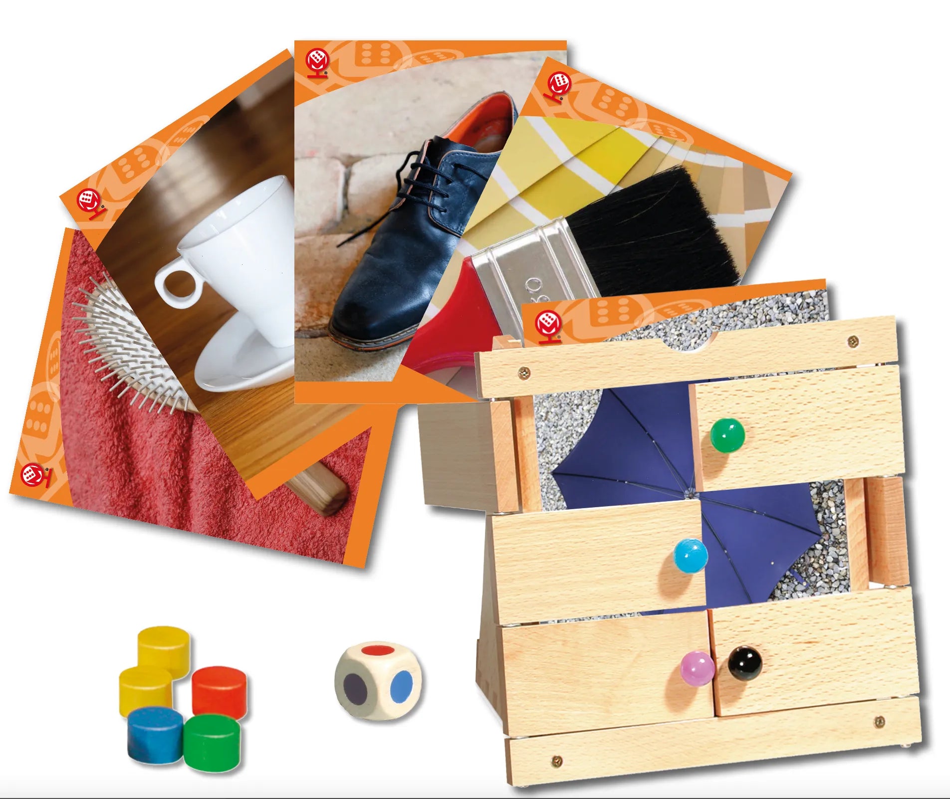 „Versteckte Bilder – Gebrauchsgegenstände“ ist ein spannendes und aktivierendes Ratespiel, das sich hervorragend für Seniorinnen und Senioren sowie für Menschen mit Demenz eignet. In einem hochwertigen Holzgestell aus stabiler Buche werden Fotos alltäglicher Gebrauchsgegenstände in Großaufnahme Schritt für Schritt sichtbar. Der Farbwürfel entscheidet, welche Klappe geöffnet wird – so entsteht ein spielerischer, intuitiver Zugang zum Erkennen vertrauter Motive.